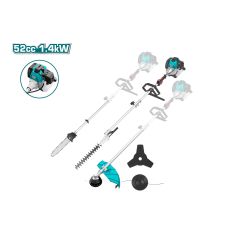 Displacement:52ccRated power:1.4Kw(2.2HP) Max speed?10000rpm Max cutting path:420mm Spool liner:2.4mmx4m Blade diameter:255mm(3teeth) Fuel tank capacity:1200ml Powerful 2-stroke motor With 1pcs grass trimmer With 1pcs bush cutter?TGTBCB95? With 1pcs hedge trimmer With 1pcs chain saw Packed by color box