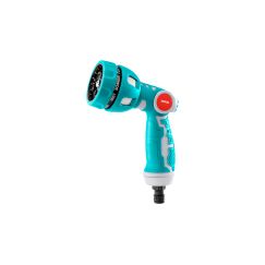 Double color 9 pattern spray nozzle with 3/4" tool adaptor9 spray patterns, including shower, angle, center, fan, cone, jet, mist, soaker, flat. Zinc alloy base with pearl silver. "U" style on/off design. Comfortable rubber grip. Packed by paper hanger