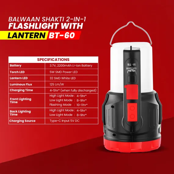 Balwaan BT-60 Shakti 2-in-1 Flashlight with Lantern 5W SMD LED, 2200mAh Rechargeable Battery, Charger with Cable, Shoulder Belt & Lantern, User Manual Included, Durable Design, 6 Month Warranty MTAK-BA-TO-7015
