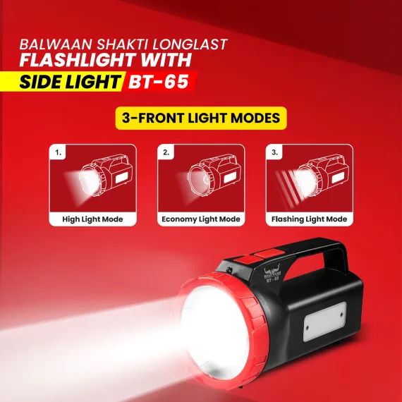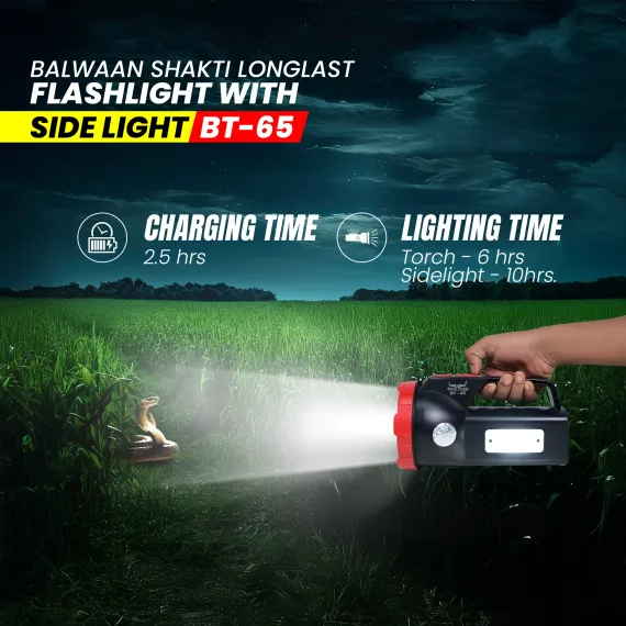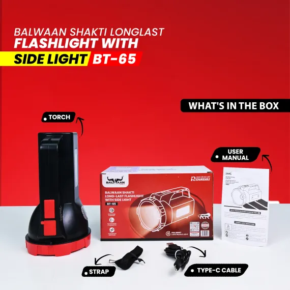 Balwaan BT-65 Shakti Longlast Flashlight with Side Light 5W SMD LED, 4000mAh Rechargeable Battery, Charger with Cable, Shoulder Belt & Side Light, User Manual Included, Durable Design, 6 Month Warranty MTAK-BA-TO-7014