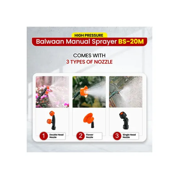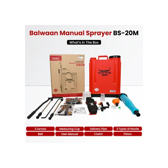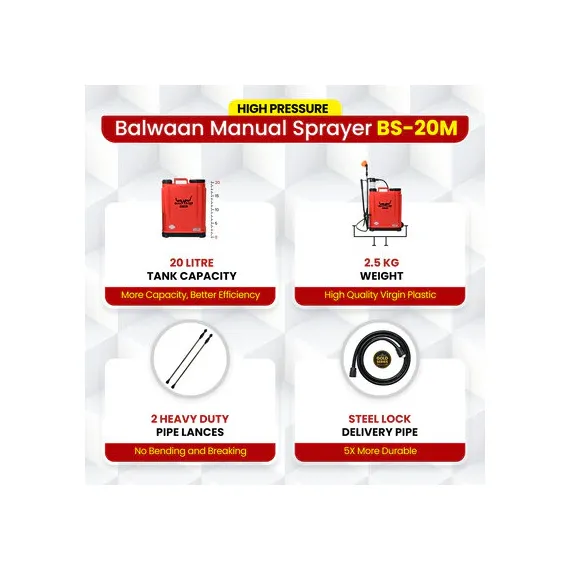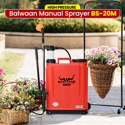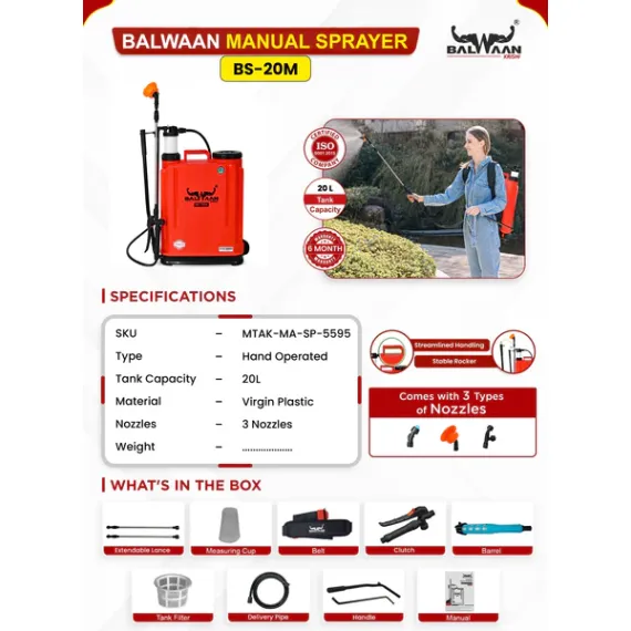 Balwaan BS-20M Manual Sprayer is a durable and efficient tool for spraying in gardens, farms, and more. With a large 20-liter tank, it holds plenty of liquid for longer spraying sessions. Made from strong plastic, it won't bend or break easily, ensuring reliability. The wide belt and cushioned back support make it comfortable to wear while spraying. It comes with 3 nozzles and 2 strong heavy-duty lances. Whether you're gardening or doing commercial spraying, this sprayer is up to the task. Simplify your spraying tasks with the Balwaan BS-20M Manual Sprayer.