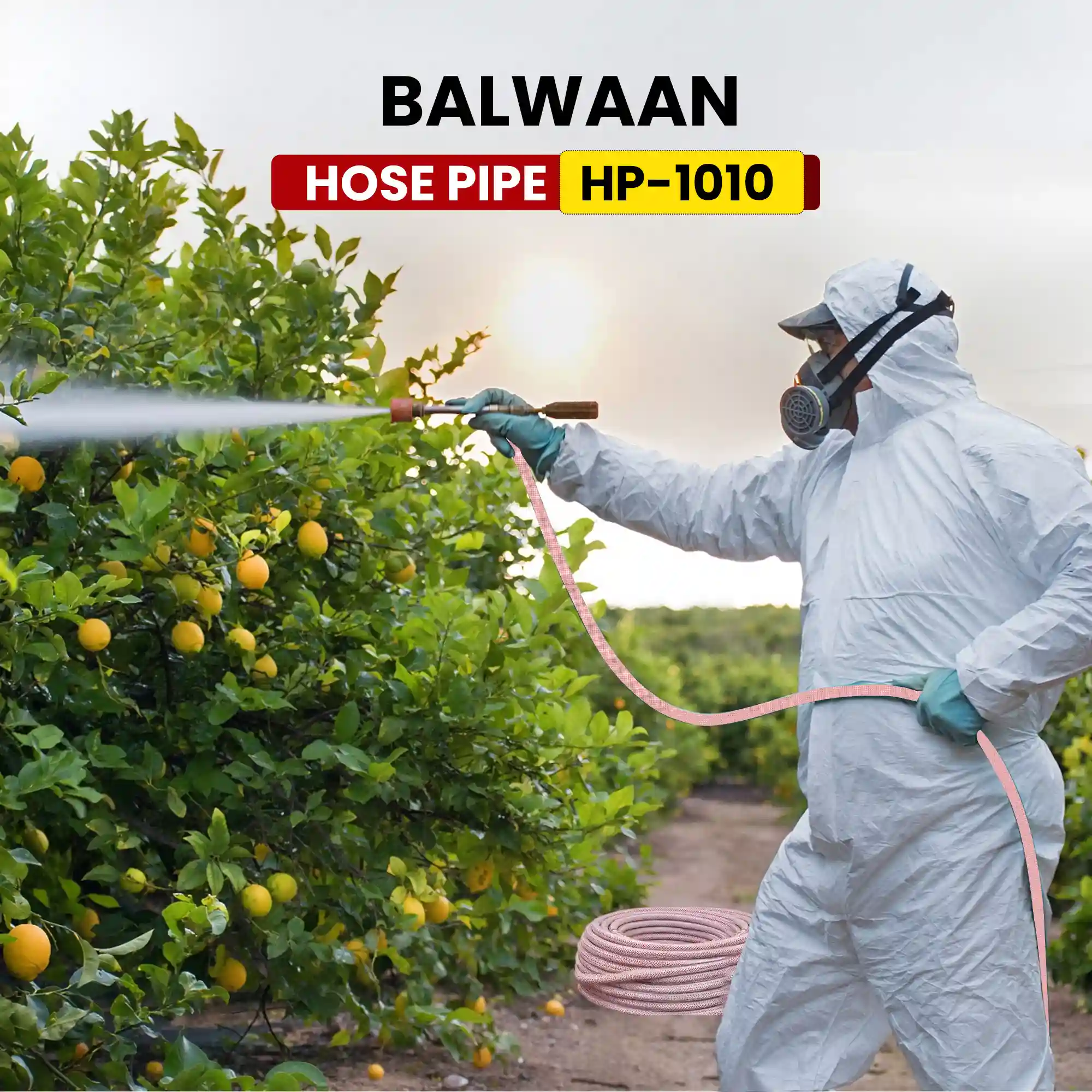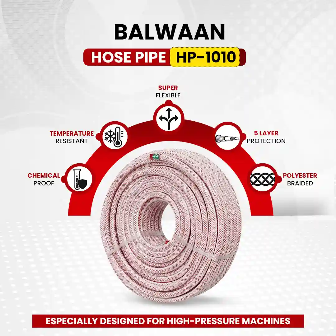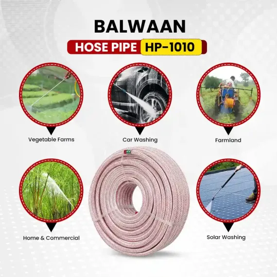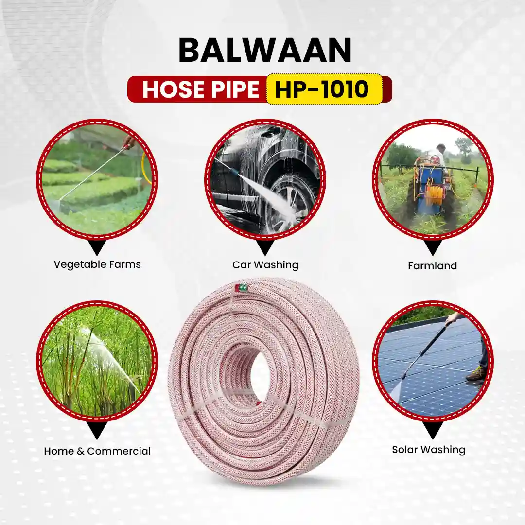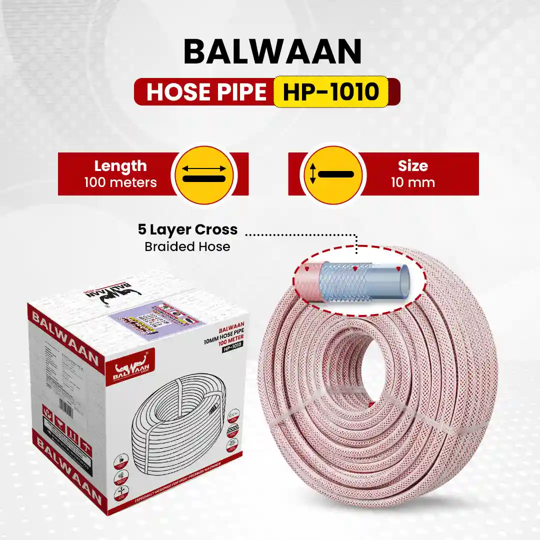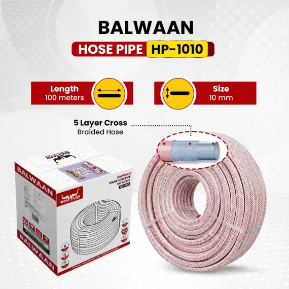 The Balwaan HP-1010 Hose Pipe is a high-performance, heavy-duty water hose built for both domestic and professional use. Featuring a 5-layer cross braided structure, it delivers superior strength, flexibility, and resistance to leaks, twists, and kinks. With a 10 mm diameter and 100-meter length, this hose pipe offers excellent water flow, making it ideal for gardening, car washing, floor cleaning, pet bathing, irrigation, and general outdoor tasks. Its Temperature resistant and chemical free design ensures reliable performance even under tough outdoor conditions. Durable, flexible, and easy to handle, the Balwaan HP-1005 hose pipe is designed for long-lasting and efficient everyday use.