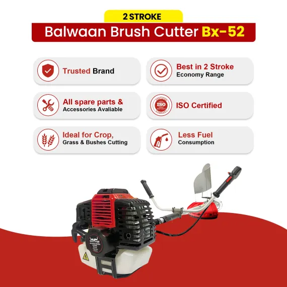 Balwaan 2-stroke 52cc Side Pack Brush Cutter is Generally used for cutting dry matured standing crops, grass, bushes, and woods up to 60mm in diameter. Crops such as wheat, paddy, maize, Jowar, Mehndi, soya bean, etc. can easily be harvested by using an 80 T blade For cutting Green fodder, bushes up to 4 mm, 3 T blade to be used. Nylon rope trimmers can be used for grass trimming and bush cutting. It displays fast trimming up to 3 mm. It can also be used for cutting dense undergrowth, and unwanted weeds, pruning trees, and trimming hedges and garden grass. It is a durable & reliable landscaping machine which is an essential tool for precision-landscaping needs. It is a lightweight, multipurpose, and very powerful machine that is used for agricultural purposes.