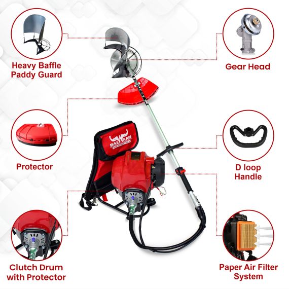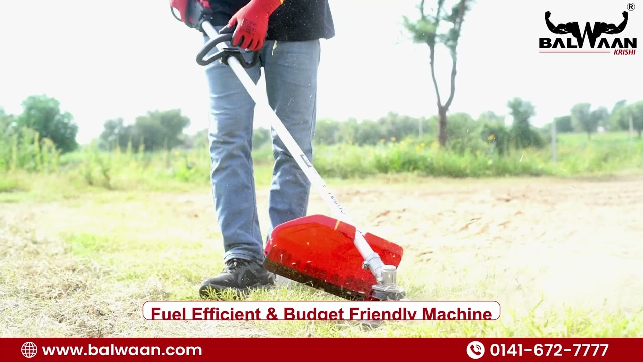 The Balwaan BX-50B is a 50cc brush cutter designed to cut dry crops like wheat, paddy, maize, jowar, soybean, and mehndi. It’s also great for clearing weeds, trimming trees, hedges, and garden grass. This grass cutter machine is lightweight, worn like a backpack, and supports 360-degree movement, making it easy to use in all directions. It is ideal for farming, gardening, and landscaping tasks. This agriculture grass cutting machine comes with 3 useful attachments: an 80 teeth blade, a 3 teeth blade, and a nylon tap-n-go cutter. It cuts crops just 2–3 cm above the soil and neatly places them aside. A person can cut 12–15 bighas of land using the 80 teeth blade. Its strong alloy steel blades and fuel-efficient, low-noise engine make this multi-attachment brush cutter a reliable and eco-friendly choice for farmers.