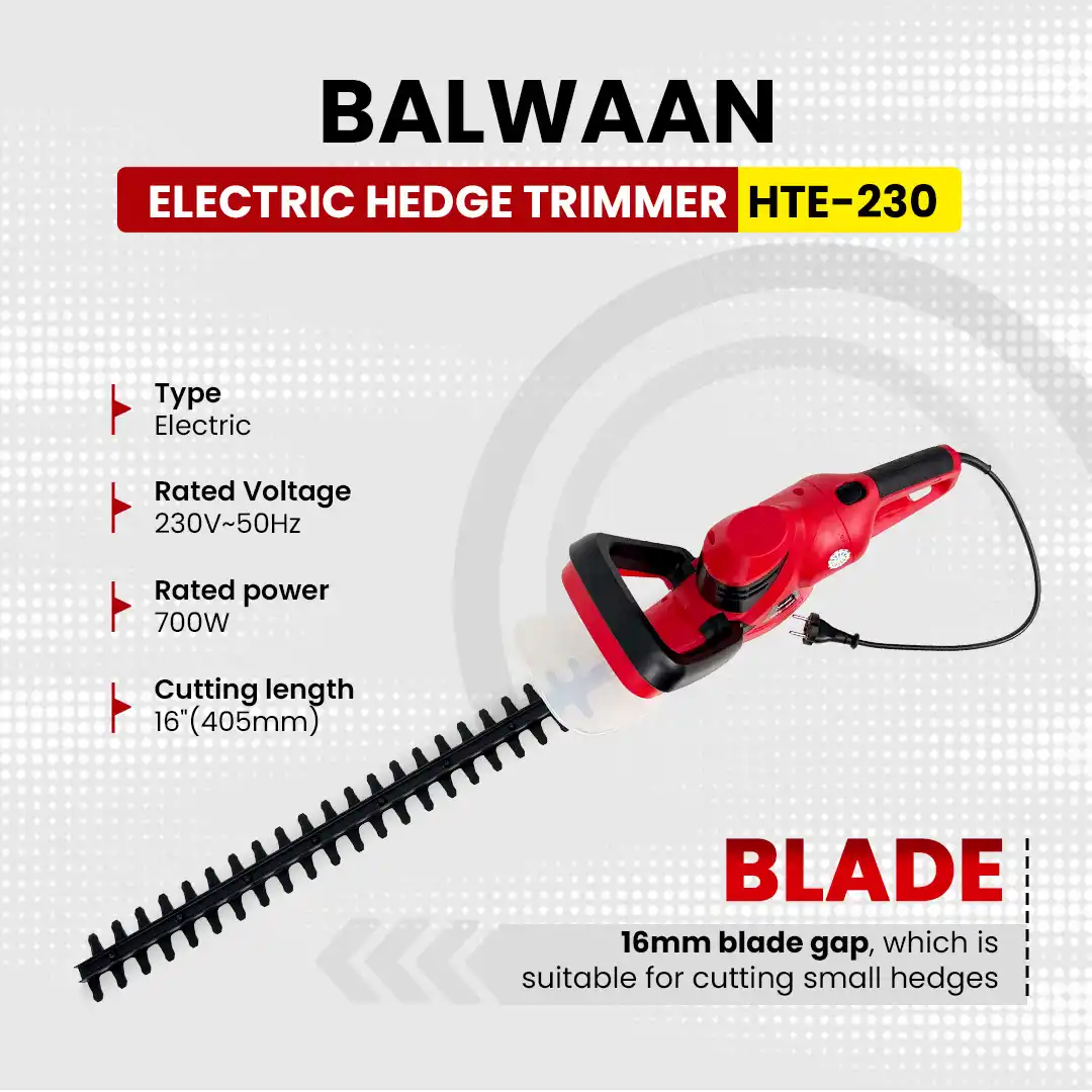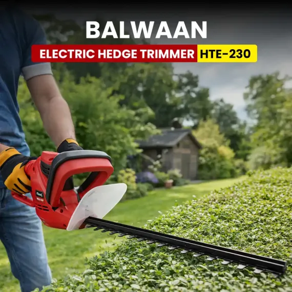 The Balwaan Electric Hedge Trimmer HTE-230 is a powerful and efficient tool designed for clean, precise, and effortless trimming of hedges, shrubs, and garden boundaries. Equipped with a robust 700W electric motor, it delivers steady and reliable cutting performance, making hedge shaping quick and hassle-free. The trimmer features a sharp and durable 16-inch long blade with a 16mm cutting gap, allowing it to handle routine hedge and bush trimming with neat and even results. Operating on a 230V power supply, it provides consistent performance for regular garden maintenance tasks. Designed with a lightweight and ergonomic body, the HTE-230 ensures comfortable handling and better control, even during extended use. Its low-noise electric operation makes it suitable for residential areas, while the eco-friendly, plug-and-use design eliminates the need for fuel, smoke, or frequent maintenance. Built for reliability and long-term use, this hedge trimmer is an ideal choice for maintaining a well-kept garden.