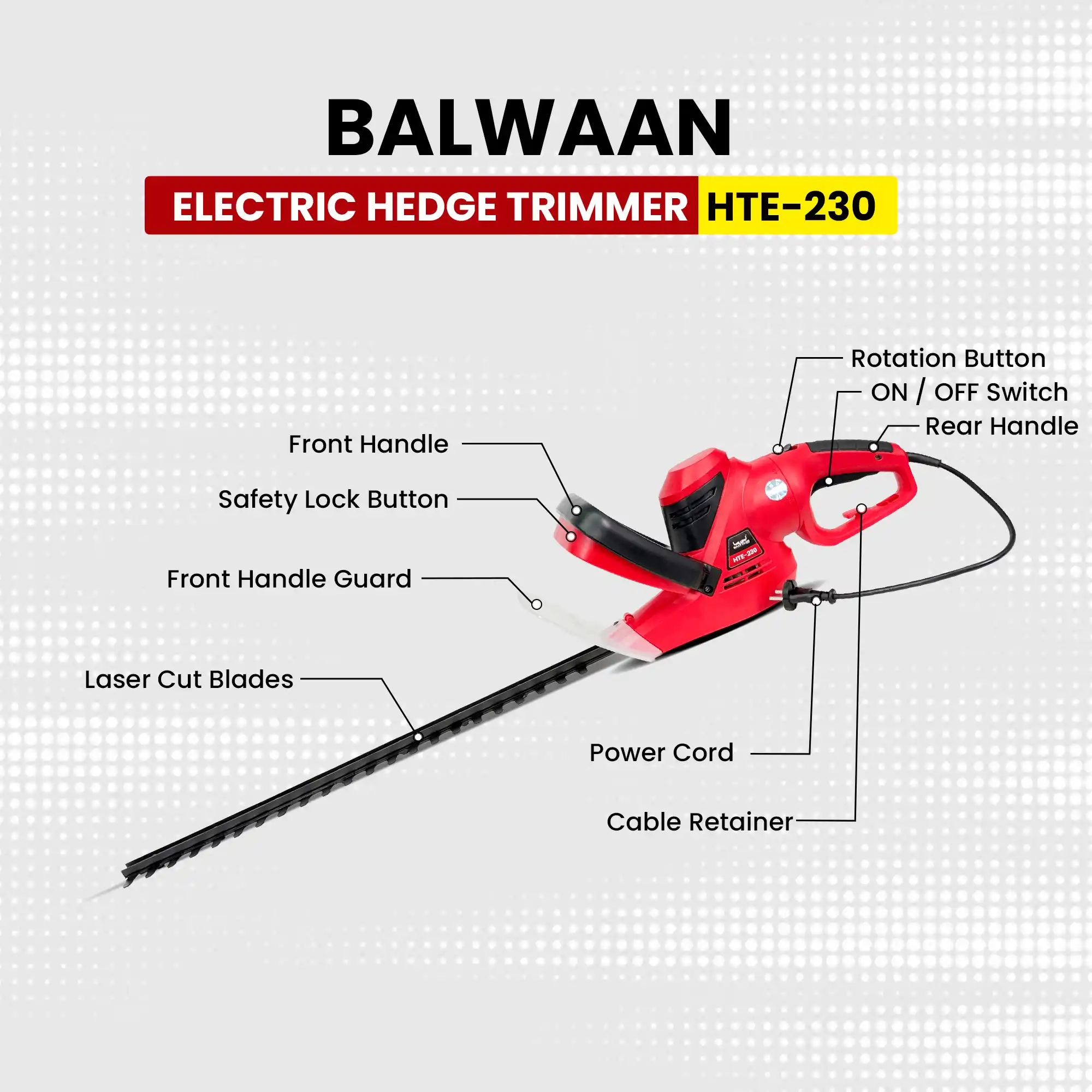 Balwaan HTE-230 Electric Hedge Trimmer 700W | 18 Inch Blade, 16mm Cutting Capacity, 3300 RPM | Rotating Handle, Lightweight Design | 12 Month Warranty | SKU: MTAK-EL-HE-7062