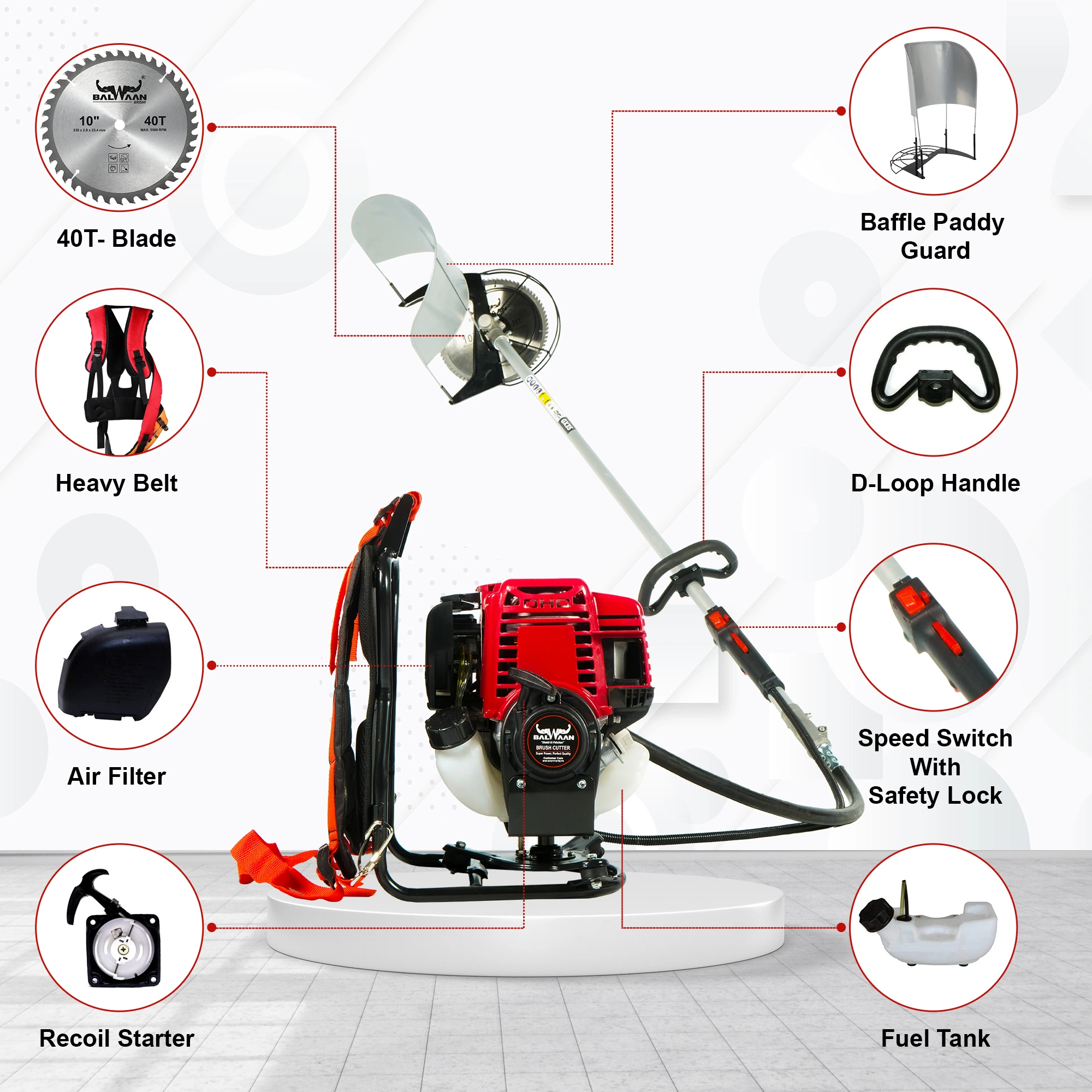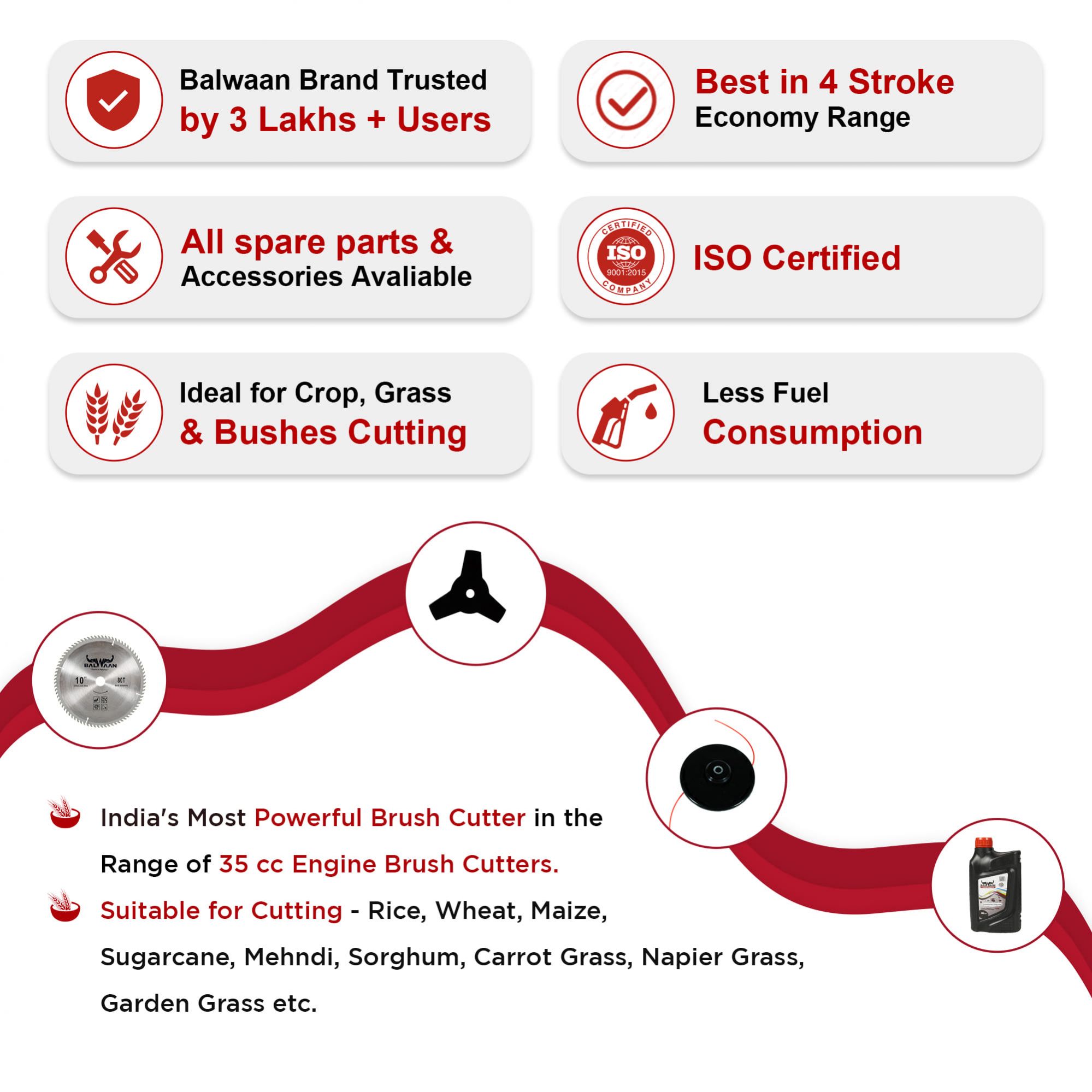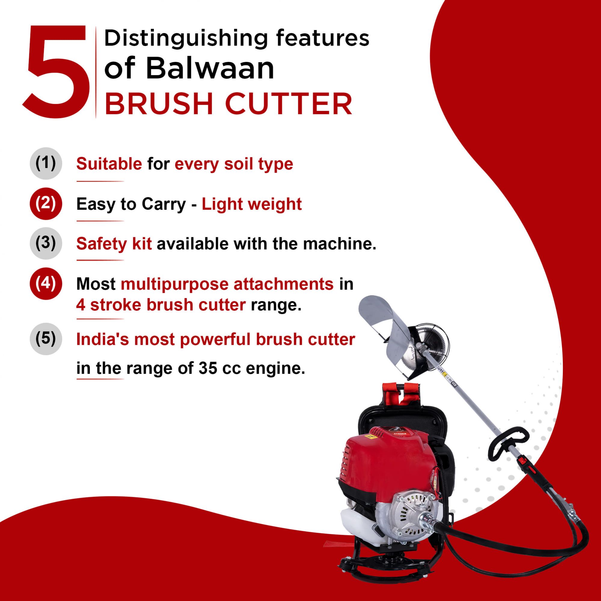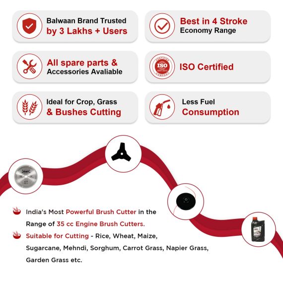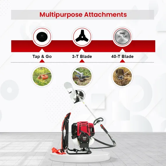 The Balwaan 4-Stroke Backpack Brush Cutter is a lightweight and powerful machine made for farmers. It is perfect for cutting dry, mature crops like wheat, paddy, maize, jowar, mehndi, and soybean. This Back-pack crop cum grass cutter is also great for clearing thick grass, weeds, trimming hedges, and pruning small trees. Worn like a backpack, it gives you 360-degree movement, making it ideal for farming, gardening, and landscaping. It supports 3 attachments – 80 teeth blade, 3 teeth blade, and nylon tap & go cutter. One can easily cut 12–15 bighas of crops using the powerful alloy steel 80 teeth blade at 70% capacity. Its fuel-efficient 4-stroke engine offers strong, eco-friendly performance. The Balwaan backpack grass cutter is a reliable grass-cutting machine, built for tough farm use. rn