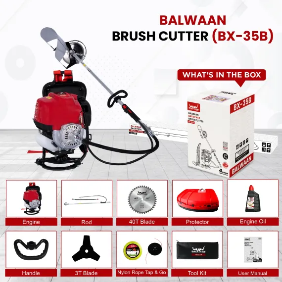Balwaan BX-35B Backpack Brush Cutter 35cc Petrol 4-Stroke | 3T & 40T Blades, Trimmer Head | Nylon Rope, Tool Kit & Guard Included | 12 Month Warranty | SKU: MTAK-EN-BR-697