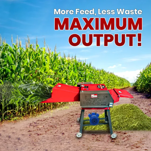 Introducing the BALWAAN Krishi CH-300 Electric Chaff Cutter, a powerful agricultural tool designed for efficient fodder processing. This robust machine features a 2.2kW/3HP motor that delivers an impressive output of 600kg per hour, making it ideal for large-scale farming operations. The precision-engineered 4-blade system, operating at 2800RPM, ensures uniform cutting lengths of 15-30mm. Built with convenience in mind, it is equipped with wheels for easy mobility and a practical on/off switch for safe operation. The integrated gear system allows for adjustable cutting sizes to meet different requirements. Operating on a 220V power supply, this chaff cutter weighs 70kg with the motor installed. The machine's high efficiency and performance, combined with its sharp and adjustable blades, make it an invaluable addition to any agricultural setup. Its low-maintenance design and energy-efficient operation help effectively manage operational costs.