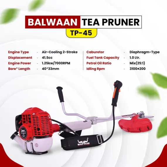 The Balwaan Tea Pruner TP-45 is a powerful and efficient tool designed for precise tea garden maintenance. Powered by a 41.5cc air-cooled 2-stroke engine with 1.25 KW at 7000 RPM, it delivers outstanding performance. Its fuel-efficient design, 100-teeth carbide tip blade, and ergonomic build ensure clean cuts, extended use, and maximum comfort. With Easy Start technology, a lightweight design, and all essential spares readily available, the TP-45 is reliable and user-friendly. The package includes a toolkit and user manual, making it the perfect choice for efficient pruning.