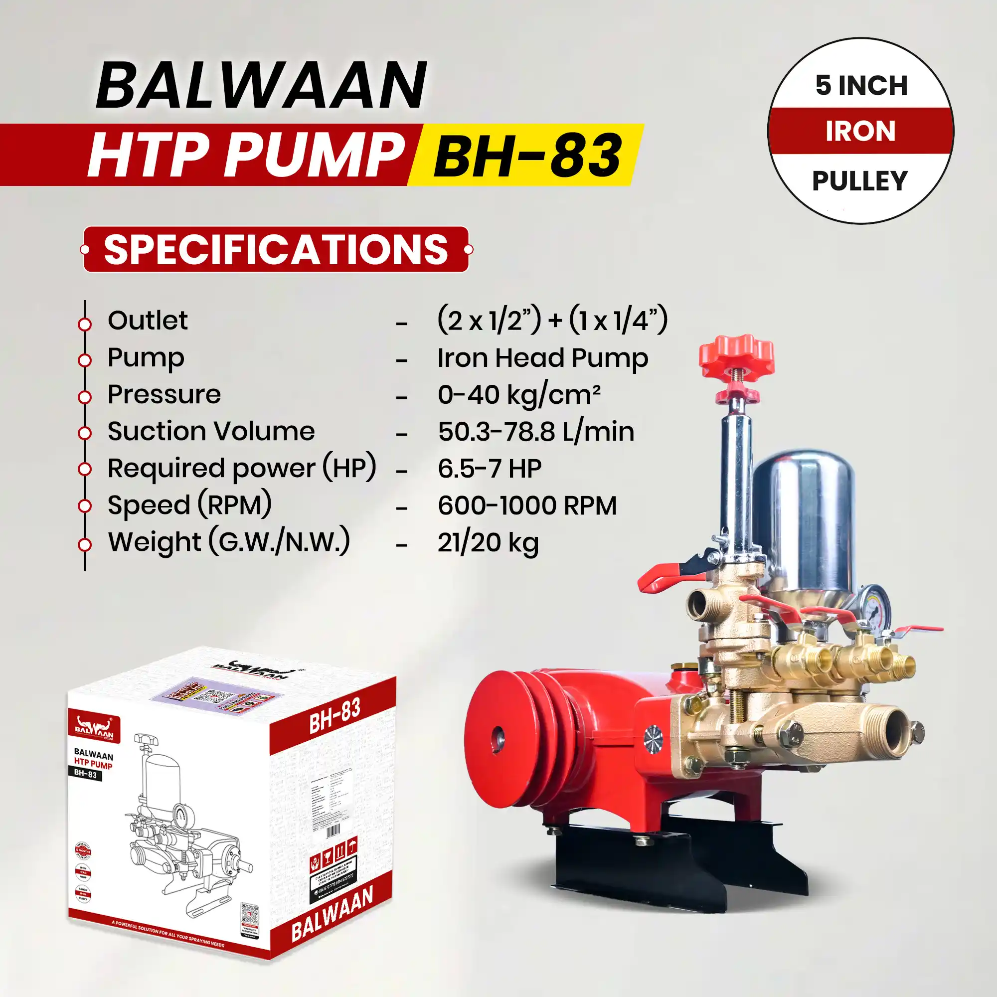Balwaan BH-83 HTP Pump (2-Mouth 1/2 + 1-Mouth 1/4) 5-Inch Iron Pulley, Wire Overflow & Suction Hose, Accessories Bag & User Manual, Heavy-Duty Performance, 12-Month Warranty MTAK-SP-HT-7048