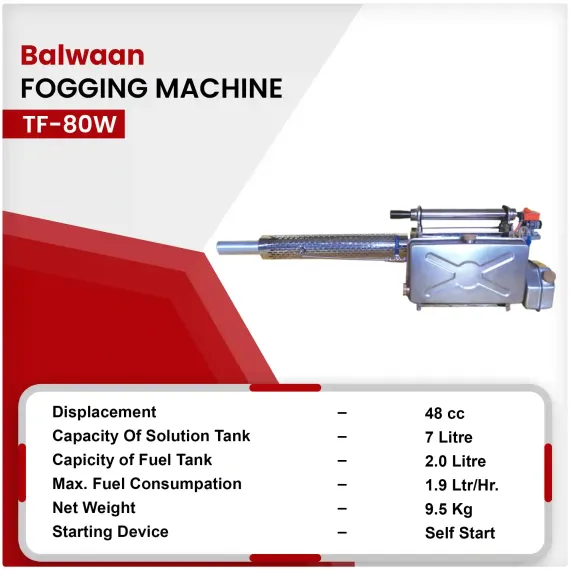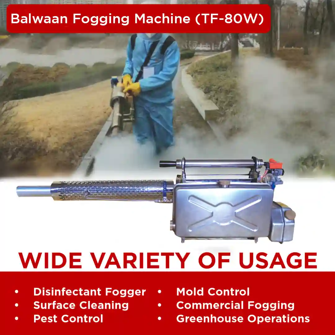 Make your sanitization and pest control efficiency easy with the Balwaan TF-80W Thermal Fogging Machine, a powerful and lightweight 48cc portable fogger designed for professional agricultural and commercial applications. Engineered with a high-performance engine and self-start system, this fogging machine delivers reliable and consistent fog output for effective area coverage.