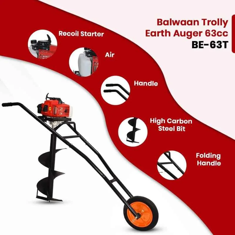 - The Balwaan BE-63T Earth Auger is a top-of-the-line product in its category. Built with precision and reliability in mind, this earth auger is designed to tackle even the toughest digging tasks. Powered by a robust 63 CC engine, it delivers exceptional performance and durability. With a fuel tank capacity of 1.7 liters, you can expect extended operation without the need for frequent refueling. The 2-Stroke engine ensures optimal power delivery and efficiency.