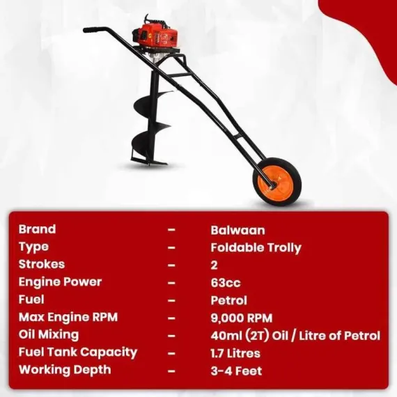 Balwaan BE-63T Trolley Tree Planter 63cc Petrol 2-Stroke | Double Gear Box (Without Bit) | Trolley Frame & Kit, Tool Kit Included | Heavy Duty Soil Planting | 12 Month Warranty | SKU: MTAK-EN-EA-981