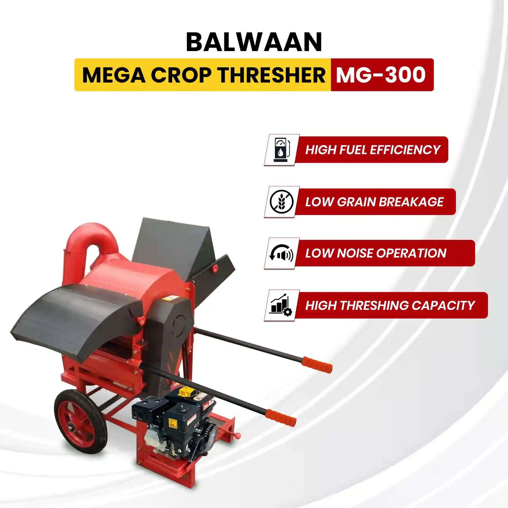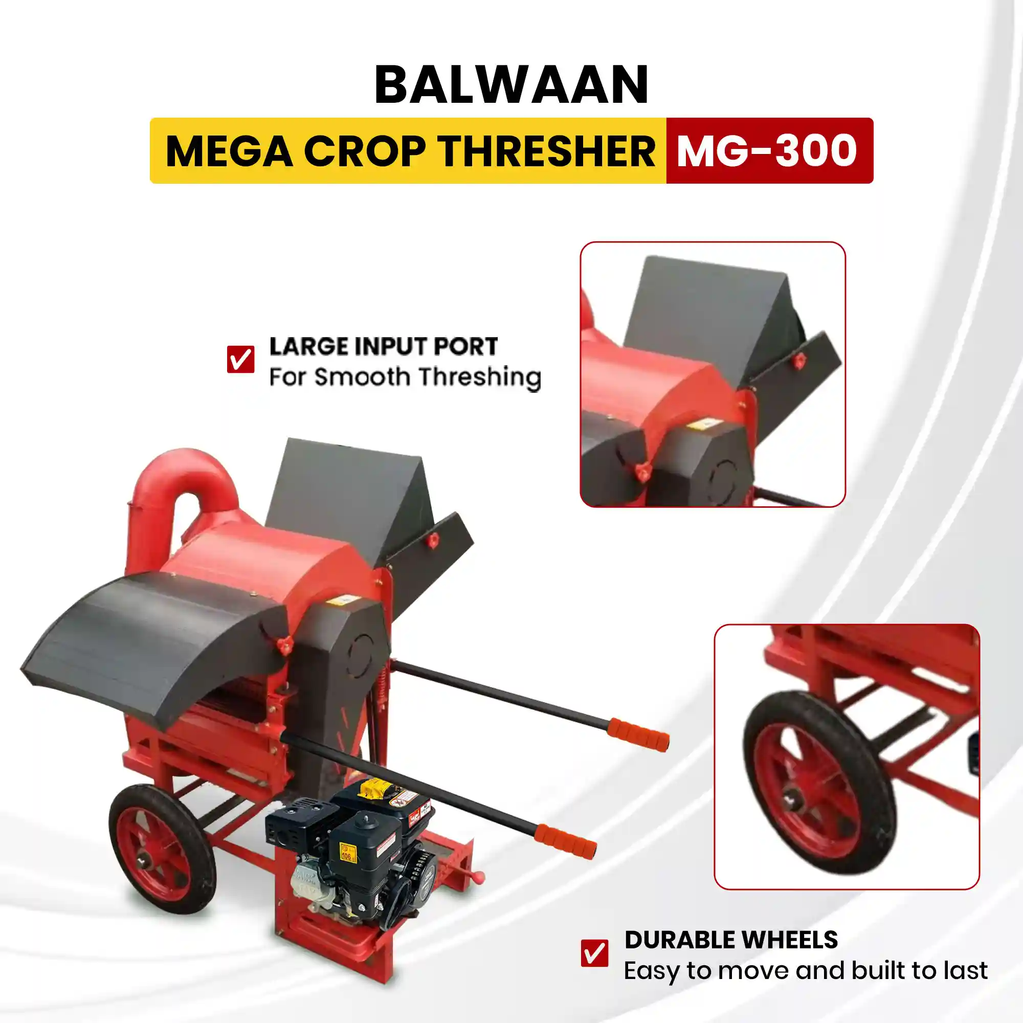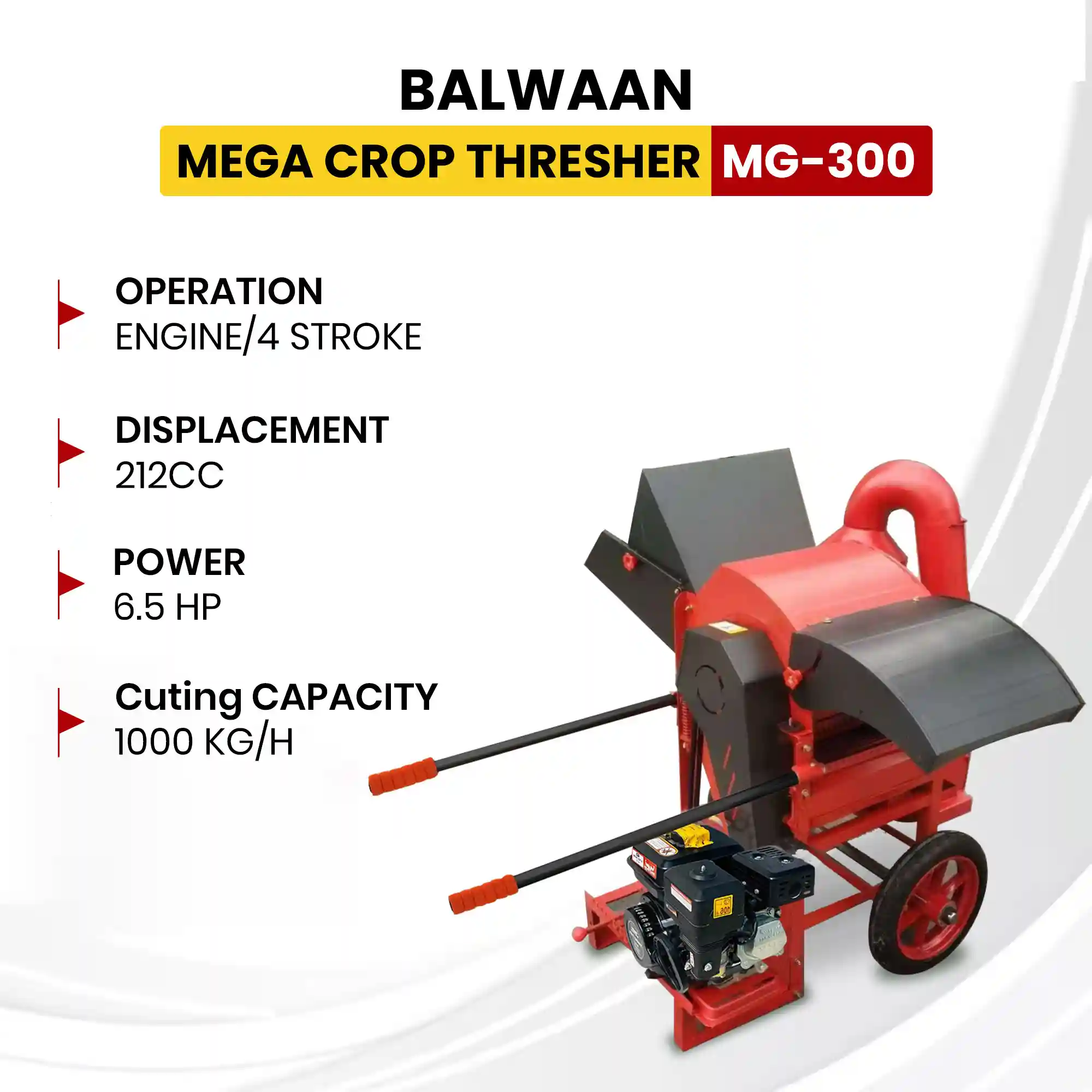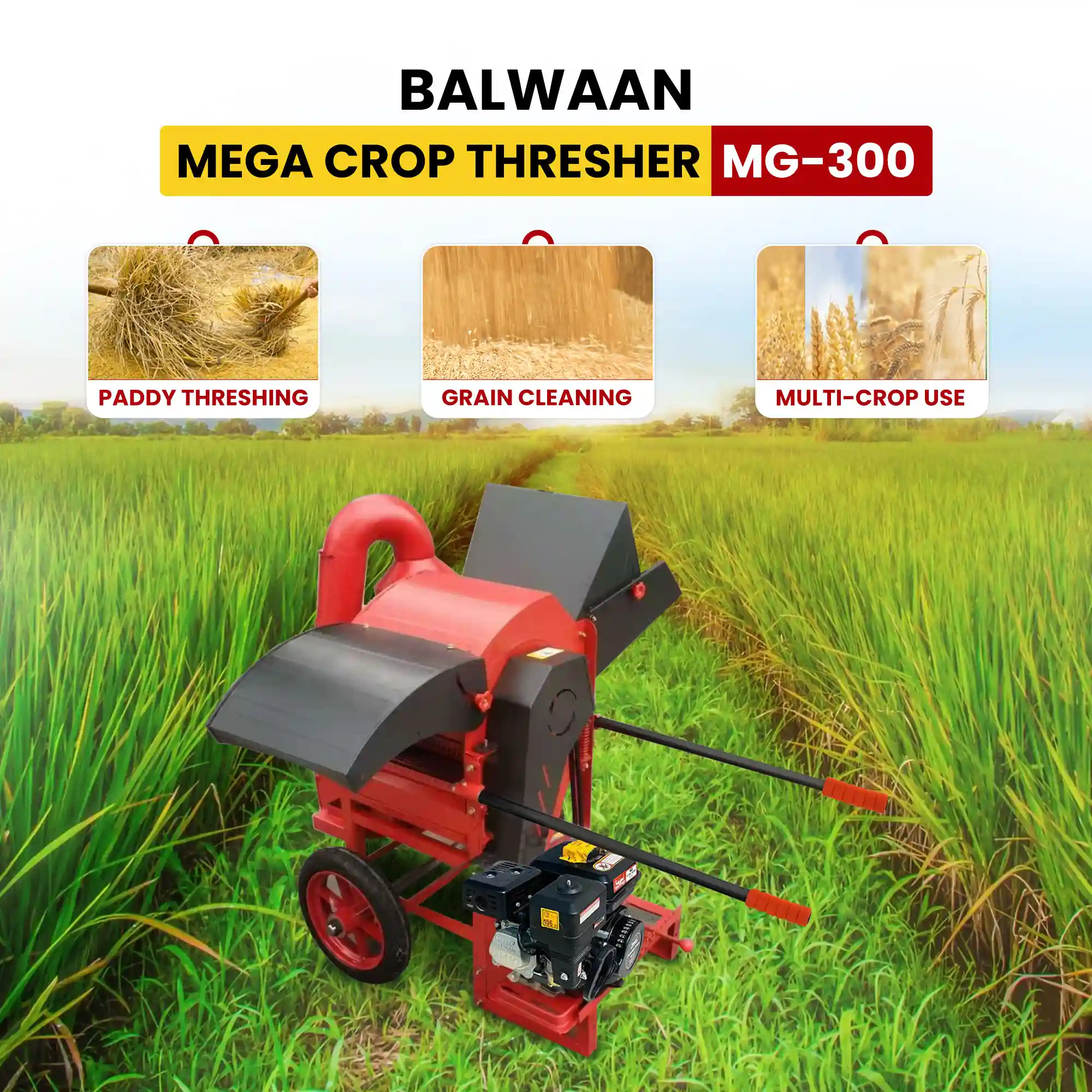 The Balwaan Mega Crop Thresher MG-300 is a high-performance agricultural machine engineered to simplify the post-harvest process for farmers. Powered by a robust 212cc 4-Stroke Petrol Engine, this thresher is designed for maximum efficiency, offering a massive cutting capacity of 1000 kg/h. Whether you are processing paddy, wheat, or various other crops, the MG-300 ensures clean grain separation with minimal breakage.