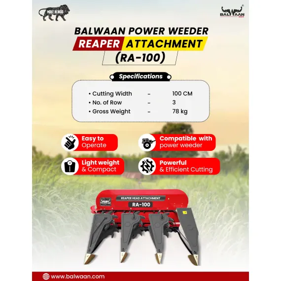 Designed as a cost-effective farming solution, the RA-100 significantly reduces dependency on manual labor, which is often expensive and time-consuming. By speeding up the harvesting process and minimizing grain loss during handling, it allows farmers to improve productivity, reduce operational costs, and bring their produce to market faster. Durable construction, stable performance, and long service life make the Balwaan RA-100 Reaper Attachment a practical and smart investment for modern agricultural operations.
