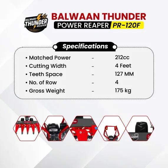 Balwaan Thunder Power Reaper PR-120F is a high-performance agricultural harvesting machine designed for Indian farmers who want faster and more efficient harvesting. Powered by a 7HP, 4-stroke petrol engine, this compact and lightweight machine delivers strong cutting performance with low fuel consumption.
